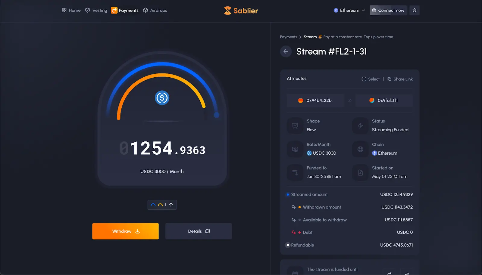 In practice, this means you can create streams that last indefinitely, that will account for debt when the sender runs out of debt, while not relying on a liquidation system, or wrapped tokens. Streams can be paused, voided, and optionally transferred (if allowed by sender) using the stream NFT, an NFT owned by the recipient that represents the stream (whoever owns the NFT is the recipient of the stream).