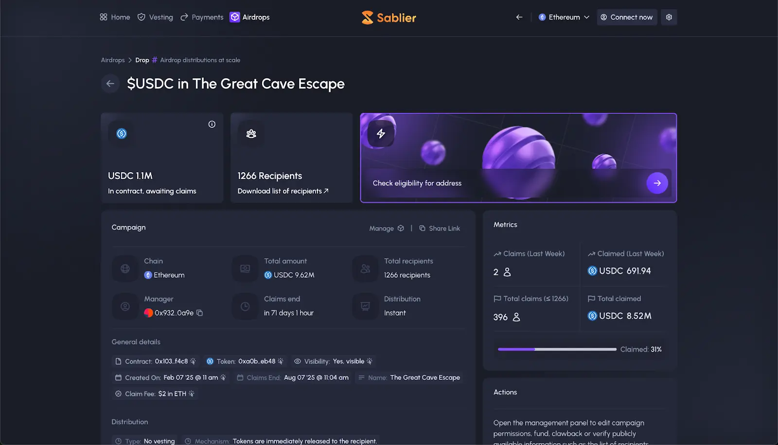 Sablier Airdrops is a tool that allows you to airdrop tokens, either instantly or via vesting streams, to hundreds, thousands and even millions of people.