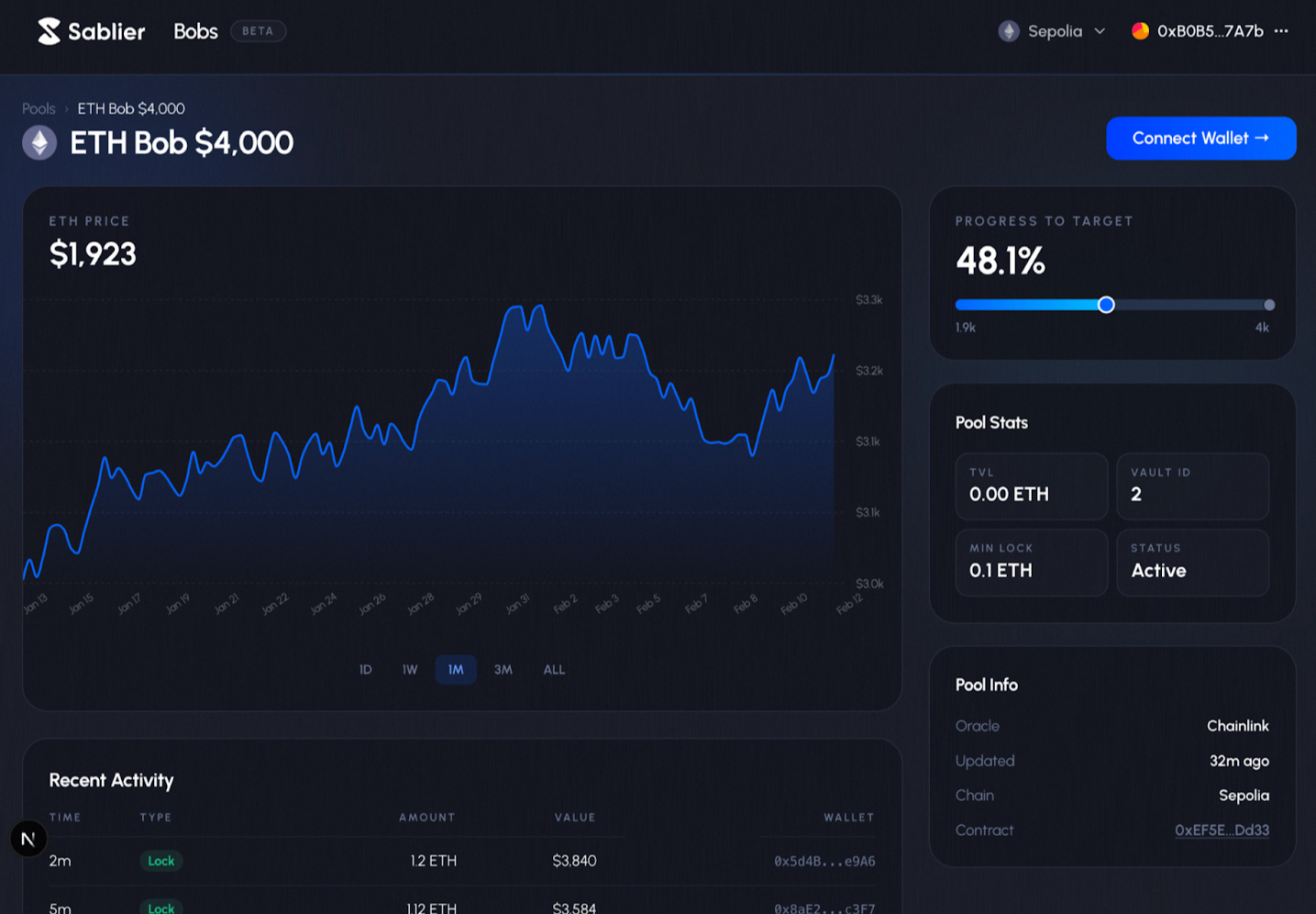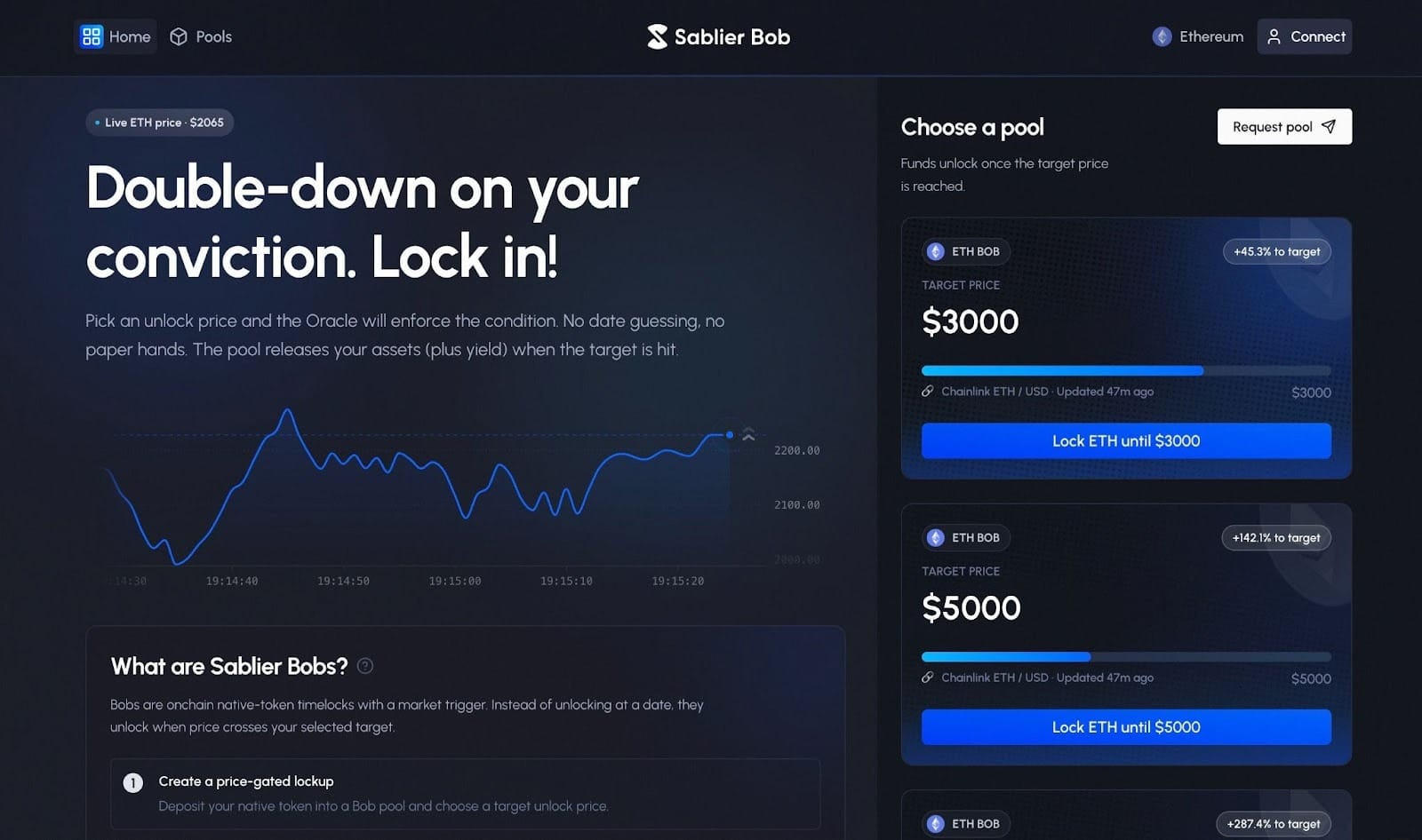 - Create a price-gated timelock — Deposit ETH into a Bob pool and choose a target unlock price.
