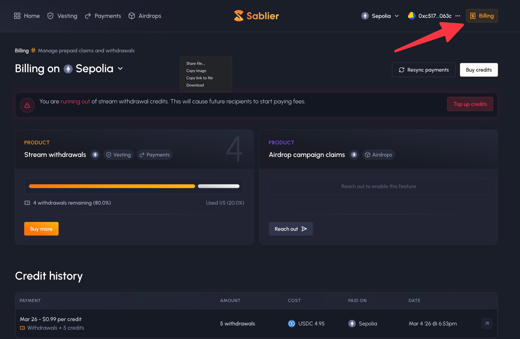When you buy credits, you're covering the withdrawal fees for your recipients. This means they can withdraw from your streams for free (they only pay network gas fees). It's a great way to improve the experience for anyone receiving payments through your vesting schedules or payment streams.