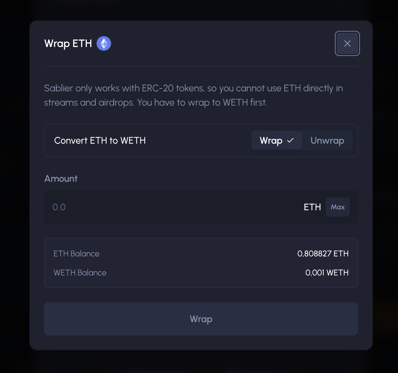 Wrap and unwrap ETH, POL, or any native asset without leaving Sablier. This removes friction when you need WETH (or equivalent) for streaming.