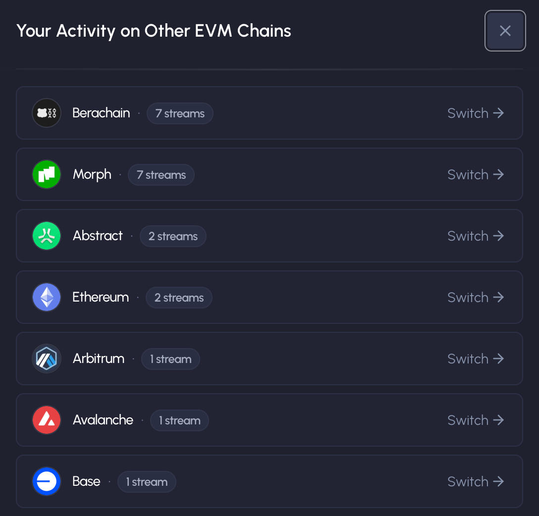 The app now surfaces your Sablier activity across other chains and displays total stream counts in both the personal and search tabs. One place to see everything.